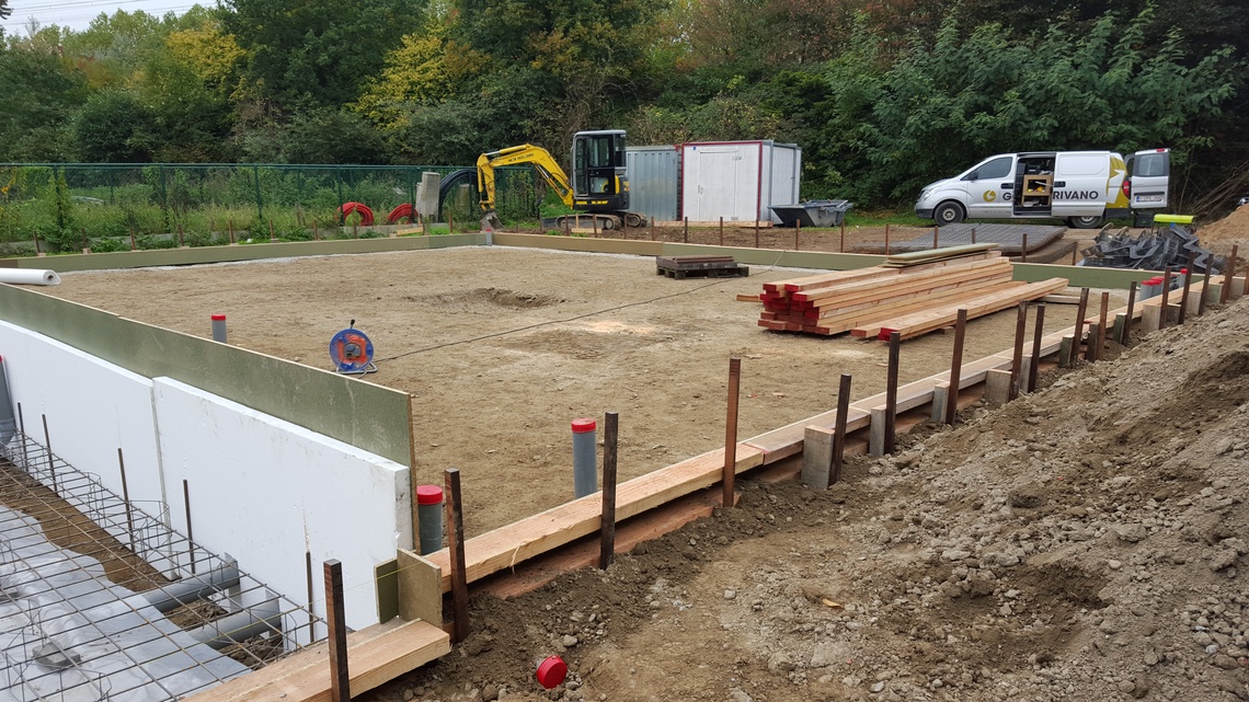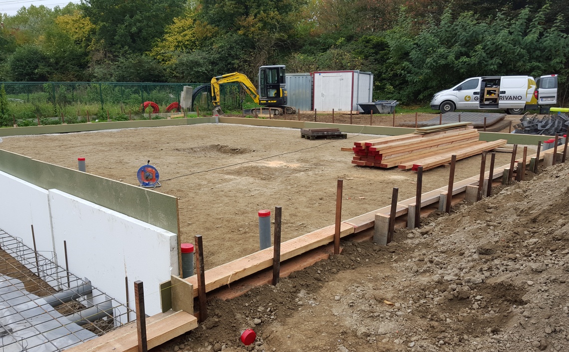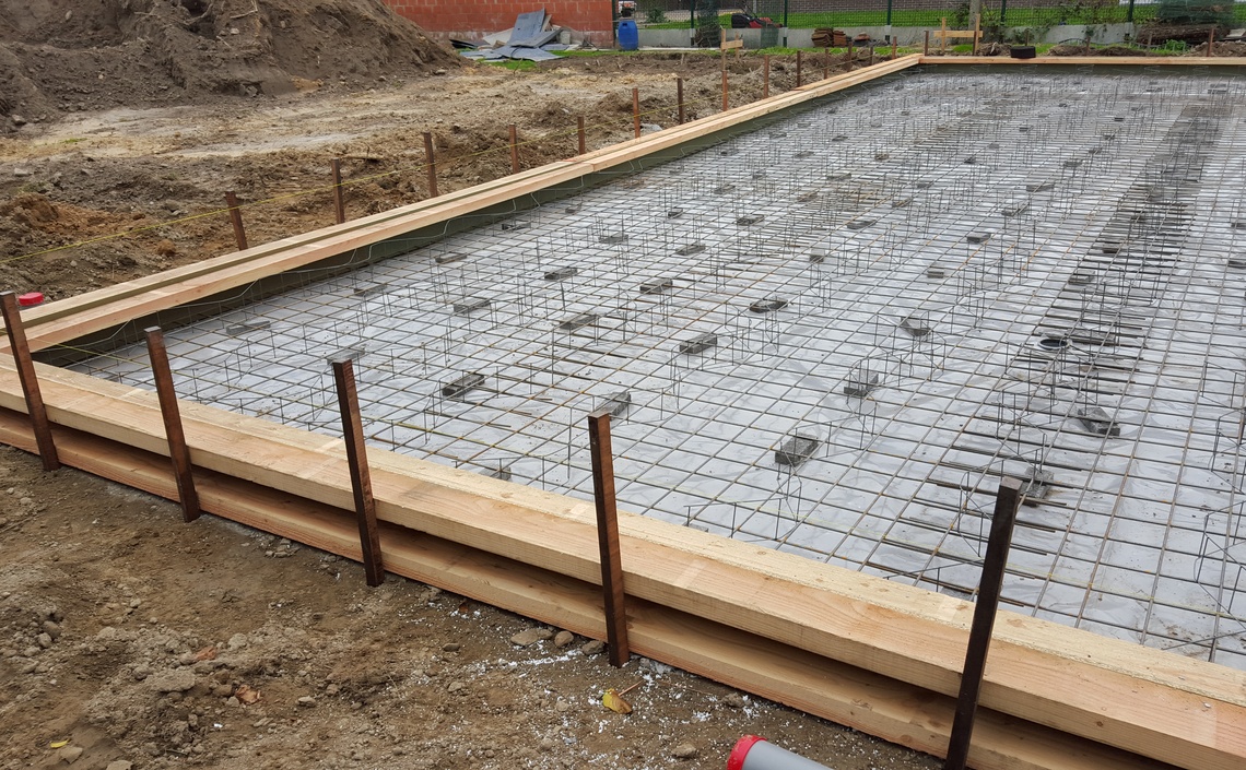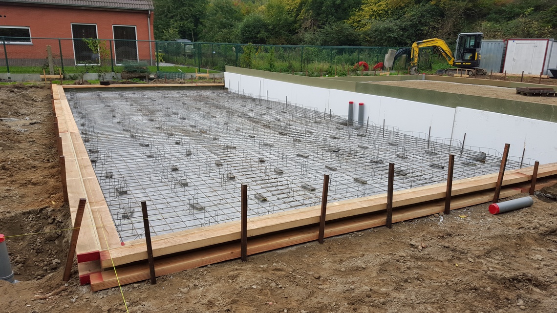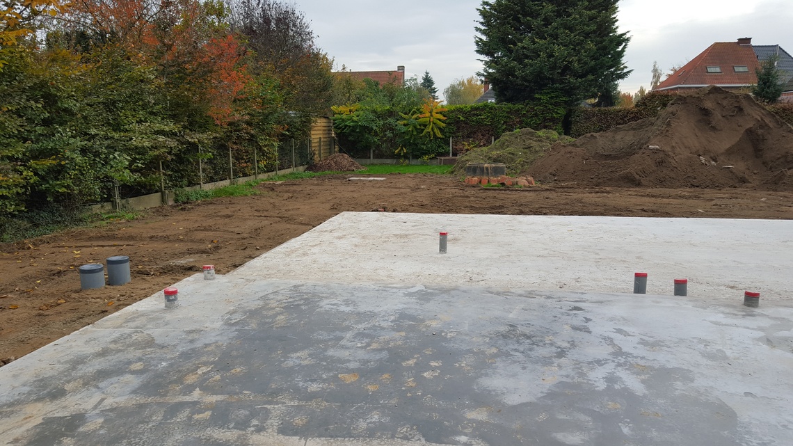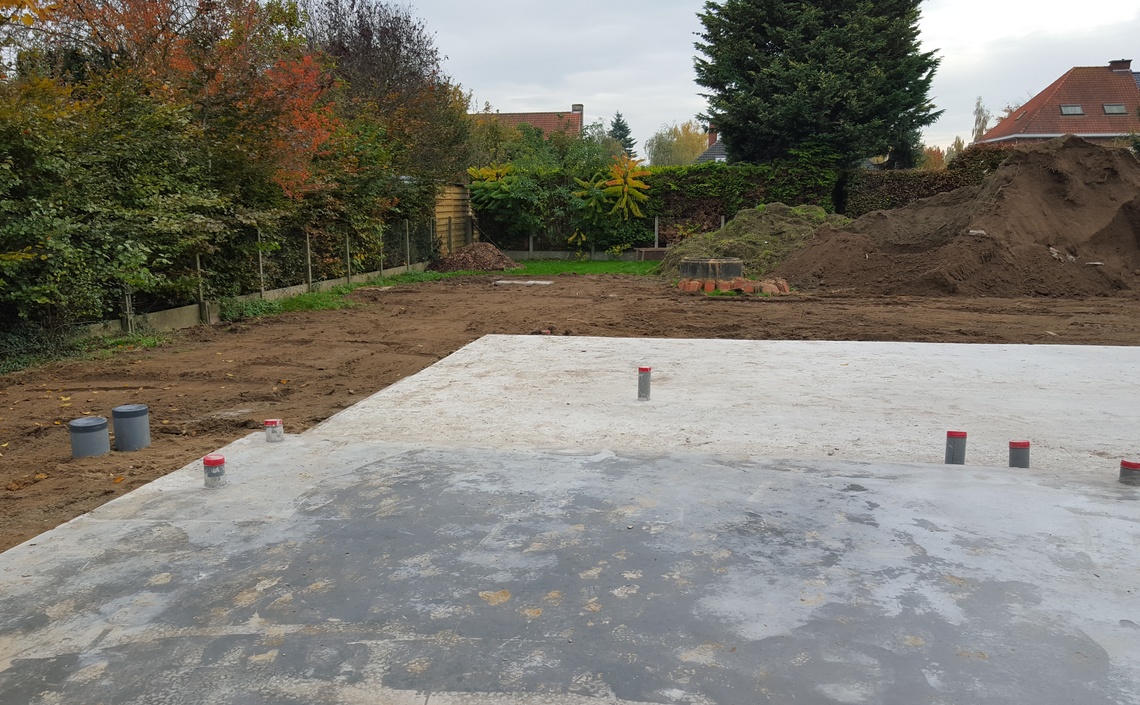 Leggen van een algemene funderingsplaat voor woning met magazijn, alsook alle binnen- en buitenrioleringen van de nieuwbouw.
